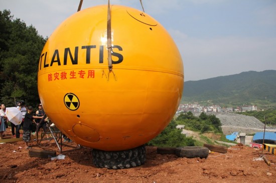 工作人員拉掉塑料布,一個橘黃色巨大球體露了出來,上面寫著“中國諾亞方舟”和“防災救生專用”的字眼。