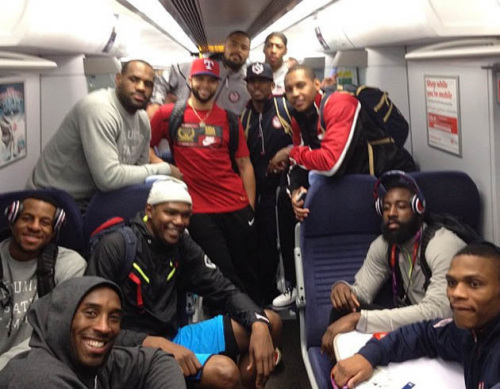 英國媒體刊登的一張照片顯示,勒布朗?詹姆斯、科比?布萊恩特以及其他“夢十”的隊員們在擁擠的列車車廂里談笑風生。