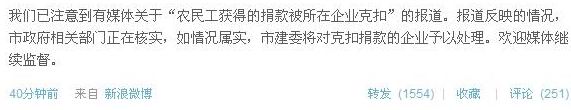 今天上午,北京市政府新聞辦公室官方微博“北京發布”發布消息:“我們已注意到有媒體關于“農民工獲得的捐款被所在企業克扣”的報道。報道反映的情況,市政府相關部門正在核實,如情況屬實,市建委將對克扣捐款的企業予以處理。歡迎媒體繼續監督。”