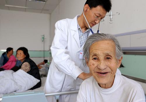 資料圖片:陜西神木縣醫院的醫生在為萬鎮鎮張家溝村82歲的毛玉葉檢查身體(2009年5月25日攝)。毛玉葉是有生以來第一次住院,胸腔大量積液,住院一月共花去8496元,個人僅花費醫保外的40多元。新華社發