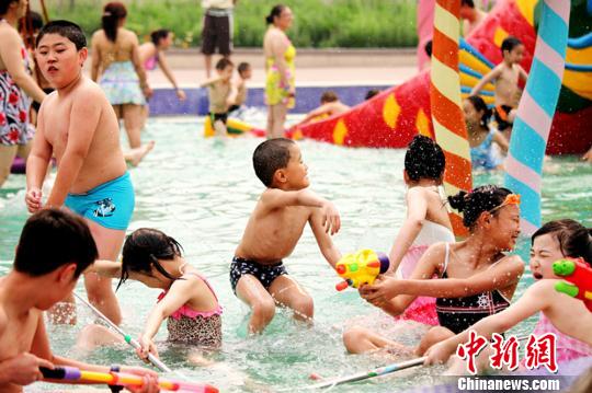 泳池內(nèi)嬉戲的兒童。袁靜攝