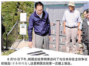 韓國總統李明博10日下午訪問了韓國與日本存在主權爭議的獨島(日本稱竹島),成為首位登上獨島的韓國國家元首。領土紛爭使韓日關系再掀波瀾。日本外相玄葉光一郎當天緊急召見韓國駐日大使,并召回日本駐韓國大使,以示強烈抗議。
