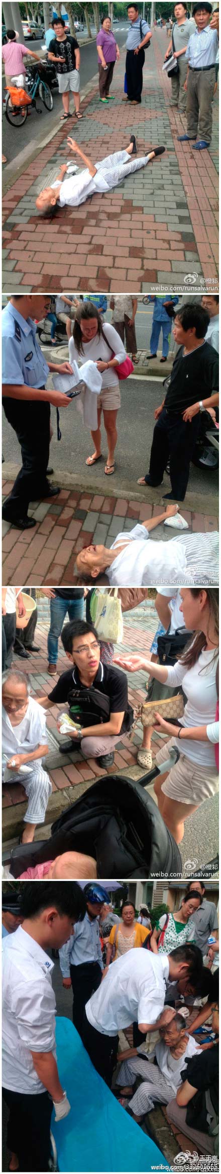 微博稱,圍觀群眾打120得到的回答卻是無車無法調配,無人敢上前扶起老人。上述外籍人士用自己的白絨巾墊在老人頭下,看著地上的血痛哭,還拿出錢給身邊的圍觀者,說幫忙交上醫藥費。過了半個小時左右,救護車才趕來將老人送到了附近的455醫院。