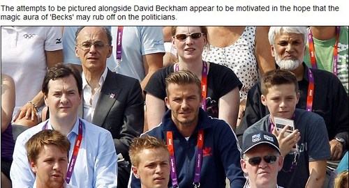 [提要] 據英國《每日郵報》8月10日報道,2012年倫敦奧運會期間,英國足球明星貝克漢姆(David Beckham)成為奧運觀眾席上最引人關注的名人之一。值得一提的是,包括英國首相卡梅倫(David Cameron)和財政大臣喬治?奧斯本在內的一些政界名人身影經常出現在貝克漢姆身邊的座位上,有“搶鏡頭”之嫌。