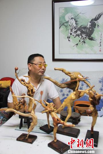 中新網張家口8月11日(譚地 宋錦豐 王雅嵐)排球、羽毛球、足球、鞍馬、體操、標槍、跆拳道……在李志強的家里,一系列的根雕作品栩栩如生,仿佛他的家也正在舉辦一場“奧運會”。11日,記者來到張家口市橋東區煤機社區,走訪了這戶普通的藝術人家。