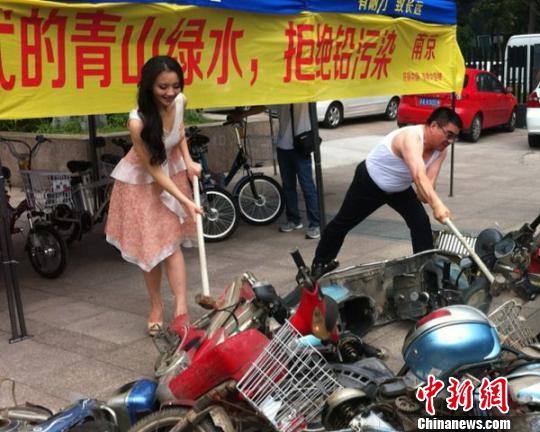 陳光標(biāo)與“槿汐”舉錘砸碎鉛酸電動(dòng)車。盛捷攝