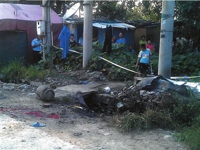 [提要] 昨天(12日)下午3點半左右,在朝陽區來廣營鄉北湖渠村內,一名六旬老太在自家門前的草叢邊被炸身亡,F場的民警稱,初步懷疑是因改裝煤氣罐,自制氫氣所致,具體爆炸原因還需調查。