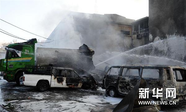 電視畫面顯示,現場黑煙滾滾,消防員正為起火的油罐車滅火,一些停靠在附近的聯合國車輛落滿塵土。