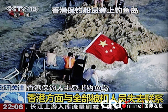 2012年8月15日下午四時(shí)二十分左右,香港保釣船啟豐二號成功抵達(dá)釣魚島,擱淺在岸邊,船上保釣人士陸續(xù)下水,涉海登上釣魚島宣示主權(quán)(央視截屏畫面)。 圖片來源:cfp