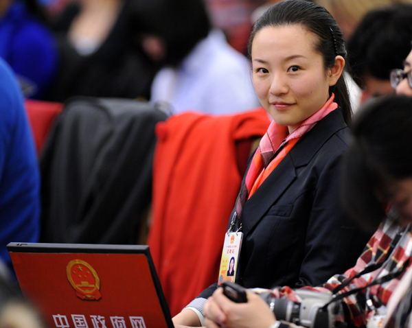 2012年3月14日11時,溫家寶總理在人民大會堂三樓金色大廳與中外記者見面并答問。圖為新華網、中國政府網記者在現場。陳競超 攝