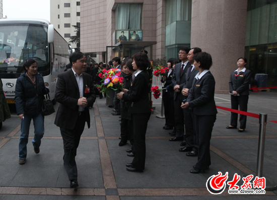 下午5:15,來自山東的180名人大代表乘車來到駐地——中國職工之家。他們雖然很是疲憊,可還是難掩一臉的興奮之情。他們一邊提著行李與熟識的代表打著招呼,一邊表示對即將開幕的兩會充滿期待。