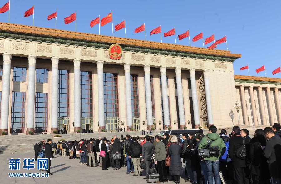 3月14日,第十一屆全國(guó)人民代表大會(huì)第五次會(huì)議在北京人民大會(huì)堂閉幕。 這是閉幕會(huì)前,記者排隊(duì)等待進(jìn)入大會(huì)堂。 新華社記者 王建華 攝