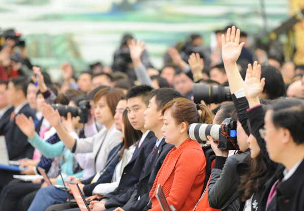 十一屆全國人大五次會議于3月6日(星期二)上午10時在人民大會堂三樓金色大廳舉行記者會,由外交部部長楊潔篪就“我國的對外政策和對外關系”問題答記者問。圖為記者舉手提問。 王翰林 攝