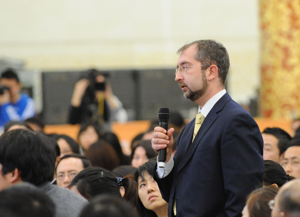 [提要] 十一屆全國人大五次會議于3月6日(星期二)上午10時在人民大會堂三樓金色大廳舉行記者會,由外交部部長楊潔篪就“我國的對外政策和對外關系”問題答記者問。圖為俄新社記者提問。