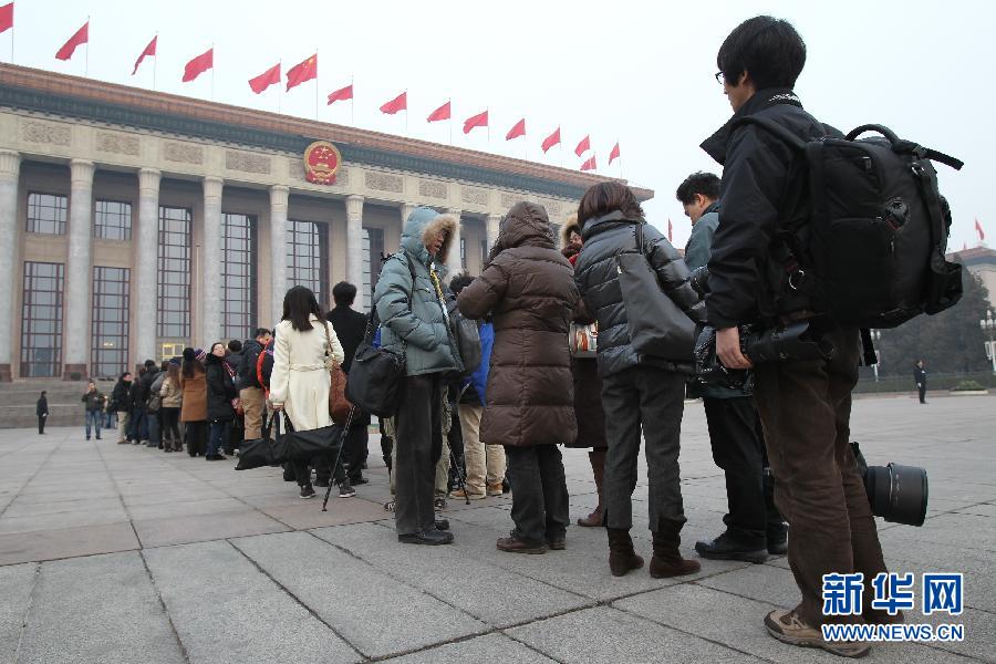 3月5日,第十一屆全國人民代表大會第五次會議在北京人民大會堂開幕。這是會議開幕前,記者在人民大會堂前排隊等待入場。 新華社記者 金立旺攝