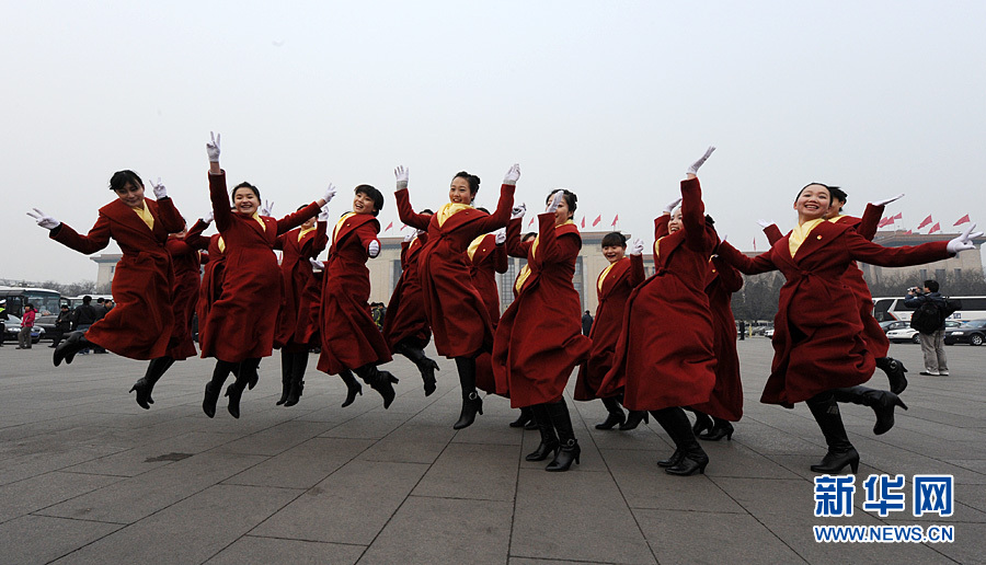 2012年3月5日上午9時,第十一屆全國人民代表大會第五次會議在人民大會堂開幕。圖為開幕會當天全國兩會住地賓館酒店禮儀小姐天安門廣場上留影。新華網 陳競超 攝