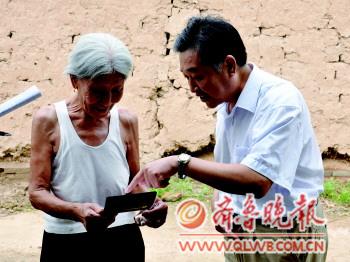 ◤沾化縣泊頭鎮83歲的鄭元英老人(左)領到了政府發放的養老金存折。 (資料片)