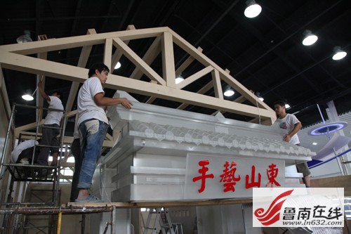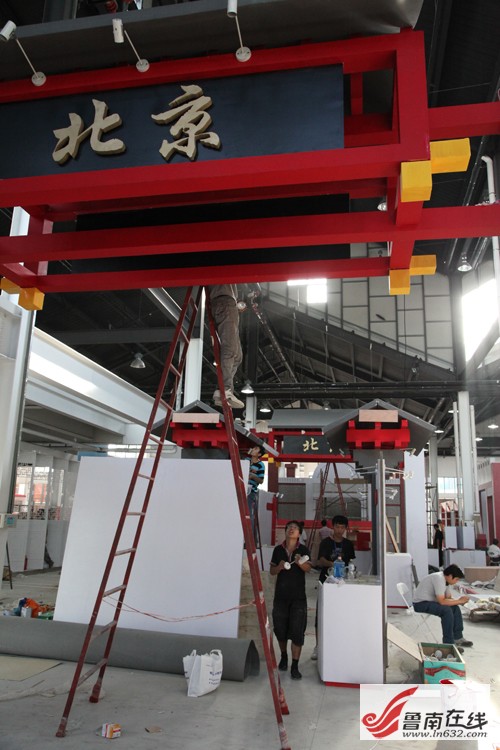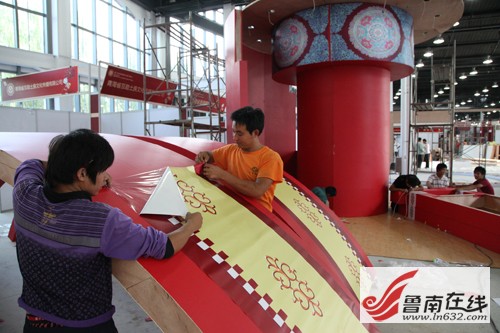 非遺博覽會會展中心位于臺兒莊古城西門入口處,分為A、B兩大區(qū)域。走進(jìn)專為全國各省(自治區(qū)、直轄市)非物質(zhì)文化遺產(chǎn)博覽交易活動設(shè)立的A區(qū),記者看到,工人們師傅們正在加緊制作門廳內(nèi)的序廳、山東廳等7個主題廳,不時地爬上爬下,頗為辛苦。不少展廳在他們的巧手制作下,已經(jīng)初見規(guī)模,如展示運河沿岸城市非遺保護(hù)成果的運河廳、有著“燕京八絕”之稱的北京景泰藍(lán)展區(qū),都被收拾的頗有特色。來自陜西西安的一位師傅說,他們來了兩三天了,目前正在按照圖紙的設(shè)計,爭分奪秒的制作展區(qū)特裝展位。