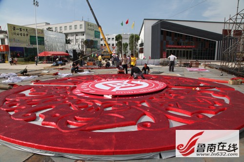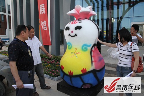 工程人員在緊張施工館內(nèi)到處都有中國元素吉祥物在場館入口處讓人喜愛蒙古包已見雛形 非遺博覽會會展中心位于臺兒莊古城西門入口處,分為A、B兩大區(qū)域。來自陜西西安的一位師傅說,他們來了兩三天了,目前正在按照圖紙的設(shè)計,爭分奪秒的制作展區(qū)特裝展位。