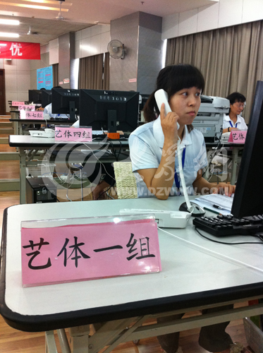 進入大廳,就看到30多名錄檢員正在緊張地進行錄檢工作,他們不停地打電話與高校聯(lián)系,身旁的傳真機在不斷地傳發(fā)錄取材料,身前的電腦里學(xué)校回檔情況、錄取資料也在隨時增加、變化。