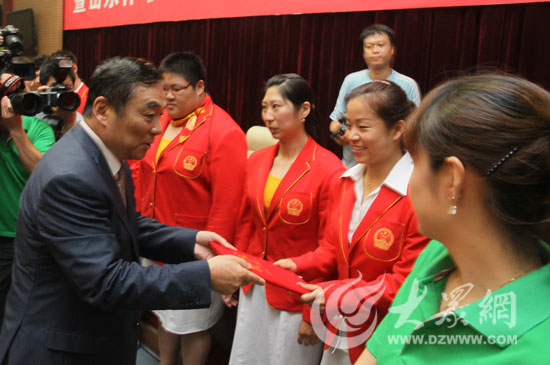 山東省體育局副局長丁艷菊歡迎載譽而歸的奧運健兒。