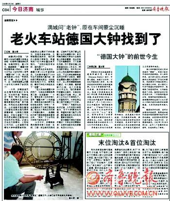 消息公布后,2008年6月24日,在眾人苦尋之下,在濟南鐵路局西郊一間庫房里蒙塵沉睡十余年的大鐘終于被找到了!濟南鐵路局濟南西郊某工務段一車間,三樓一間倉庫式的房間里,記者看到大鐘在庫房地上拆散放置著,四個豎放在墻上的表盤直徑在1.3米左右,阿拉伯數字都在,時針和分針以及上弦的搖柄等關鍵部件也在,不過大鐘的鑄鐵底座在拆遷時受了點輕傷,鑲嵌有金屬貓頭鷹的木質擺桿不見了,這上面有德國鑄造商的徽記,令人惋惜。據保管部門介紹,這個大鐘是2002年左右,他們工務段搬家時放置在這里的,本單位的職工基本不知情,所以,很多人認為這個大鐘消失了。從市里到郊外,大鐘安身這里之前已經搬過了三次家。