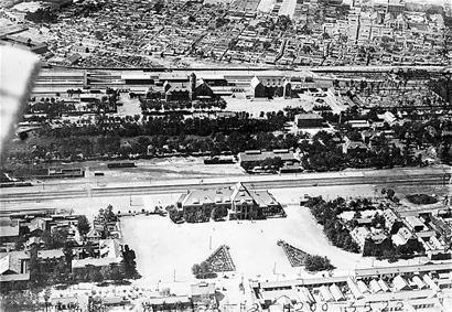 1928年,濟南兩座老火車站的“合影”。照片為由南向北航拍,上半部分清晰可見津浦鐵路濟南火車站(1992年7月拆除)及其周邊,下半部分為膠濟鐵路濟南火車站及其周邊。 (選自山東畫報出版社2011年3月出版第75輯《老照片》 馮寶忠供圖)