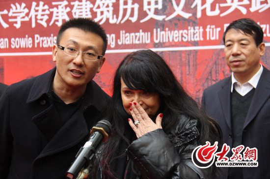 今天上午,濟(jì)南老火車站設(shè)計(jì)者的孫女西維亞夫婦來到山東建筑大學(xué)圖書館,參加“菲舍爾與濟(jì)南老火車站暨山東建筑大學(xué)傳承建筑歷史文化實(shí)踐”圖片展。在發(fā)言最后,當(dāng)西維亞用漢語說出“謝謝”時(shí),她被現(xiàn)場觀眾的熱情感動(dòng)得再次落淚。