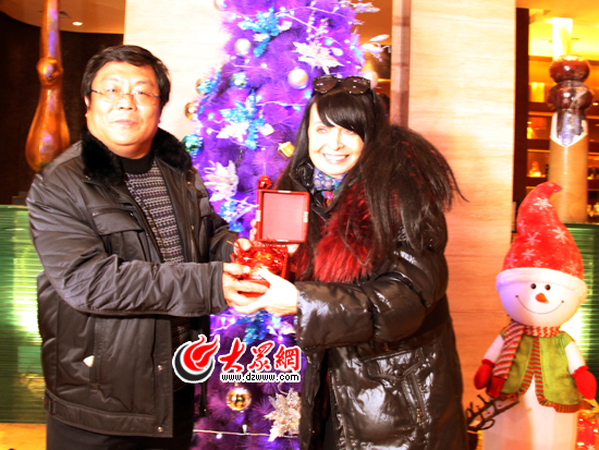 隨后,在酒店的一棵圣誕樹下,西維亞手捧這個特別的禮物,執意要與陪同她的天橋區政府的工作人員合影留念。她說,這是最好的圣誕節禮物,請大家幫她記錄這美好的時刻。