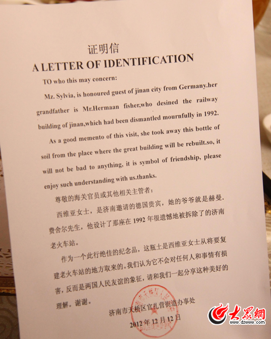 濟南天橋區官扎營街道辦事處為西維亞帶回一瓶來自老火車站舊址的泥土,開具通關證明信。