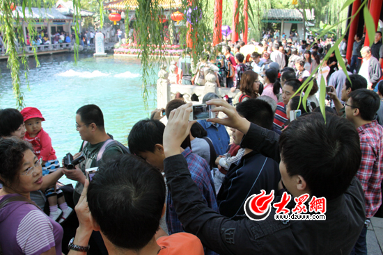 濟南趵突泉公園的三股水被游客圍了個“里三層、外三層”。