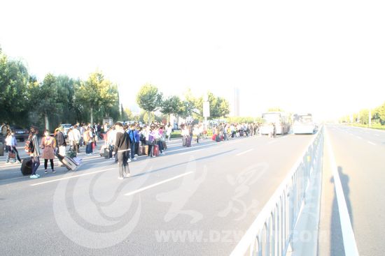 長清大學(xué)城山東師范大學(xué)站,等車的學(xué)生在馬路上排開數(shù)十米長。