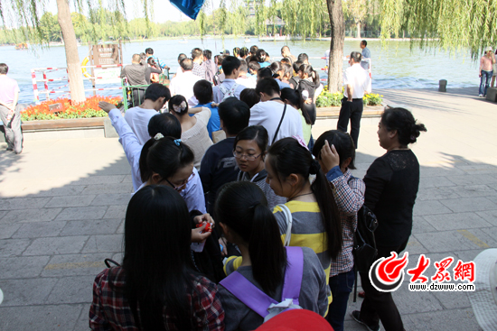上午9點(diǎn)30分,記者在趵突泉公園的標(biāo)志性景觀趵突泉三股水附近看到,眼前黑壓壓的人群已經(jīng)將三股水圍了個(gè)“水泄不通”,“讓一讓,照個(gè)相”等聲音不絕于耳。不少游客被擠在后面看不到趵突泉三股水的風(fēng)采,只得將相機(jī)高高舉過頭頂,從鏡頭中一睹三股水的芳容。“人實(shí)在太多了,不過也有心理準(zhǔn)備。”來自萊蕪市的黃先生說道。他說,自己一家早晨7點(diǎn)就從萊蕪趕到濟(jì)南,雖然知道今天人肯定多,不過也愿意來湊個(gè)熱鬧。