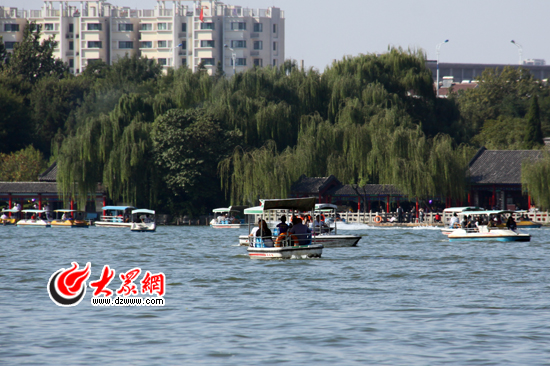 不少游客乘船游覽大明湖。