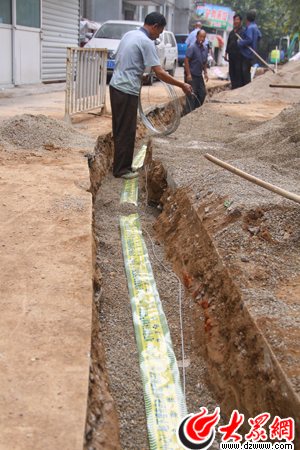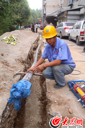 4日下午,在濟南市舜玉北區93號樓前,在濟南水務集團供水管網工程師賈振忠指揮下,一節節直徑為110mm的PE塑料管經過熱熔機加熱密封聯接后,變成了一條百余米的管道,被工人們放到早已挖好的溝槽中。不遠處,挖掘機在小區內的一條主干道旁開挖新的溝槽,為幾天后鋪設主管網做準備。