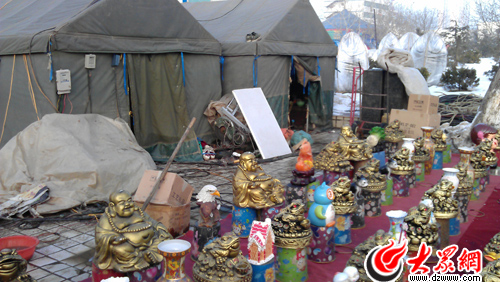 生意不好,幾個人就坐在“臥室”里嗑瓜子閑聊。說是臥室,其實就是綠色帆布搭建起來的簡易帳篷,里面墊上磚塊,磚塊上面再鋪上木板就成了床。王明說,在這里,取暖基本靠“擠”。“在家千日好,出門一日難,沒出過門是想不到有多苦,慢慢習慣了,心態好了,就沒事了。”