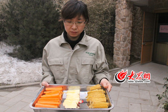 濟(jì)南市動物園的大熊貓飼養(yǎng)員賀景昭向大眾網(wǎng)記者展示大熊貓的節(jié)日“加餐”:胡蘿卜、蘋果和雜糧做的干糧