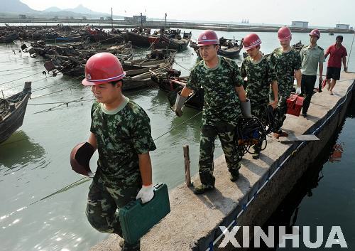 9月5日,船艇修理廠官兵在青島市膠南東山村漁碼頭為漁民維修漁船。新華社記者 李紫恒 攝
