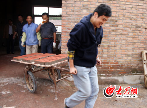 整個過程雖然看似簡單,但卻需要大量的經(jīng)驗和高度的耐心。工人師傅們不僅要指導記者正確的姿勢和手法,還要時刻提醒記者注意安全。記者目送著經(jīng)過辛苦勞動的底料和石粉一并被送進壓制機,一轉(zhuǎn)眼,12塊紅磚就新鮮出爐了。