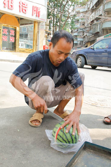 [提要] 在夏季吃上一個涼爽的西瓜既解渴又祛暑,真是美事一樁,而為市民們奉上這美味的瓜農們卻每天要頭頂烈日把西瓜采摘、收好,再連夜運到市區,無論氣溫多高他們都會堅持著把收獲的西瓜賣完。7月2日、3日,記者來到賣瓜農的瓜攤前,親身體驗了一下賣瓜的辛苦。