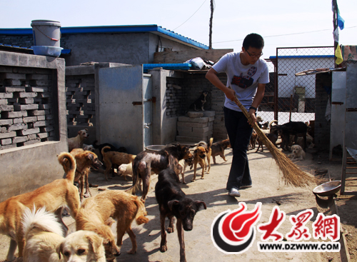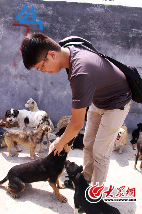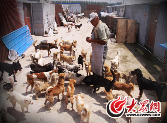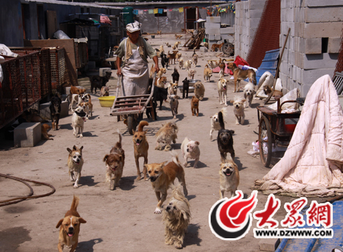院子的門口,三四個工人正將一塊刻著“泰山小動物保護中心”字樣的石碑豎在門前。推開大門,三四只小狗搖著尾巴圍了過來,在記者腳邊嗅來嗅去。而放眼望去,小院的四周全是磨著水泥的狗舍,陌生人的進入,引得全院子數千只狗齊吠。“不用怕,這些狗光叫不咬人!闭郎蕚湮构返内w大叔在四、五十只只狗的簇擁下,把記者帶進院子。