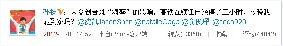 “因受到臺風(fēng)“海葵”的影響,高鐵在鎮(zhèn)江已經(jīng)停了三小時,今晚我能到家嗎?@沈凱JasonShen @natalieGaga @俞俊琛 @coco920。”這是孫楊今天14:52分發(fā)布的一條微博,從內(nèi)容上可以看出,孫楊今天坐高鐵回家,但無奈遭遇到臺風(fēng)“海葵”,高鐵被迫在鎮(zhèn)江停留三個小時,這讓孫楊擔(dān)心能否在今晚順利到家。