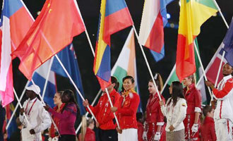 8月12日,第30屆夏季奧林匹克運動會閉幕式在倫敦奧林匹克體育場舉行。這是中國代表團旗手、奧運會女子激光雷迪爾級冠軍徐莉佳(右三)在閉幕式上高舉五星紅旗入場。新華社記者凡軍攝