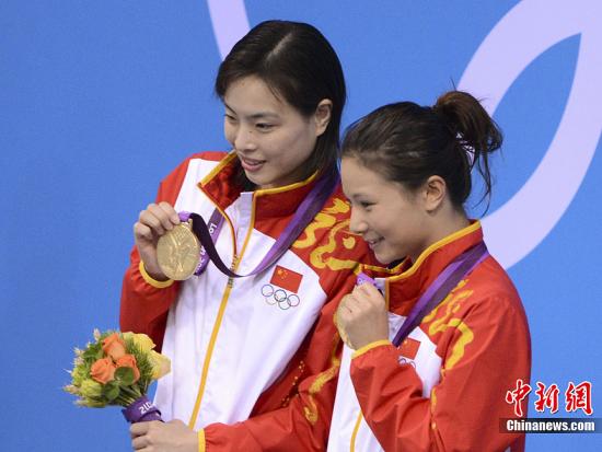 當地時間7月29日下午,倫敦奧運會女子雙人3米板跳水決賽中,中國選手吳敏霞、何姿獲得金牌。記者 廖攀 攝