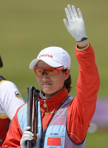 7月29日,在倫敦奧運會女子飛碟雙向決賽中,中國選手魏寧以總成績91中獲得銀牌。新華社記者王慶欽攝