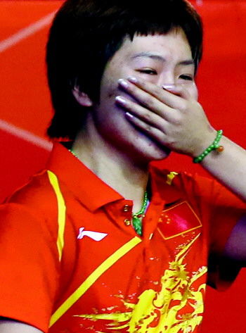 繼2011年世錦賽和世界杯之后,這是一年多來李曉霞和丁寧第三次會師大賽決賽。前兩次,都是丁寧取得勝利,而這次笑到最后的是李曉霞。比賽結束后,丁寧流下了委屈的淚水。李曉霞也哭了,卻是喜極而泣。三次巔峰對決,李曉霞以兩次失利的代價,贏下了最關鍵的一場勝利。