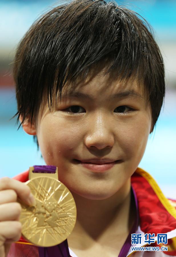 2012年7月31日,在倫敦奧運會游泳女子200米個人混合泳決賽中,中國選手葉詩文以2分07秒57的成績獲得冠軍,并創(chuàng)造新的奧運會紀錄。圖為,葉詩文展示金牌。新華社記者 費茂華 攝