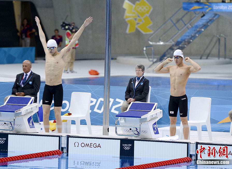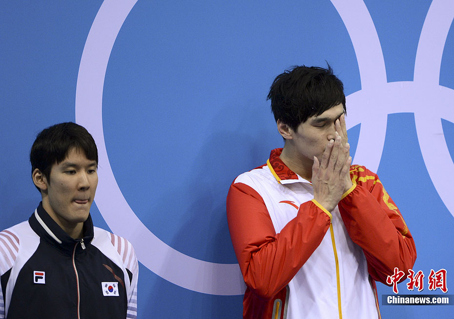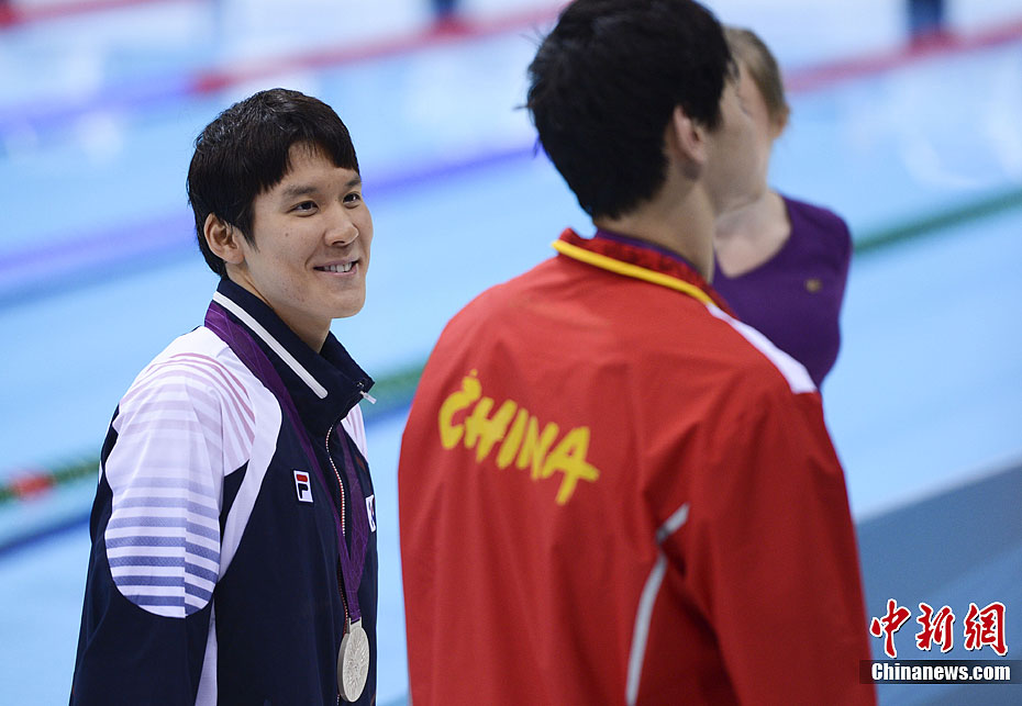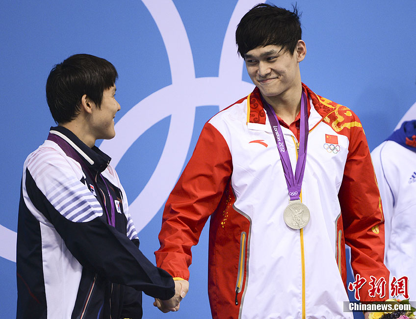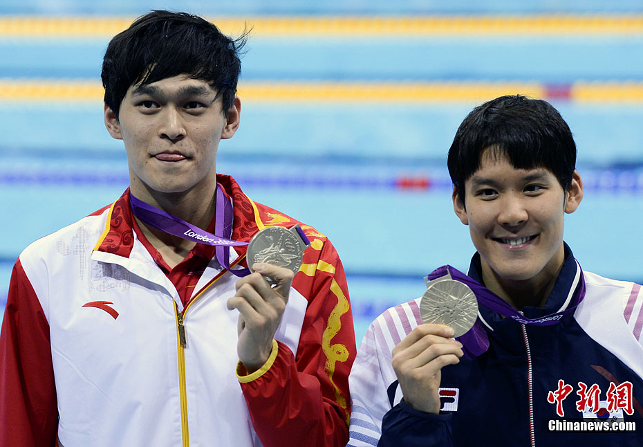 當(dāng)?shù)貢r間7月30日,倫敦奧運會男子200米自由泳決賽,中國選手孫楊(左)、韓國選手樸泰桓并列亞軍。記者 廖攀 攝