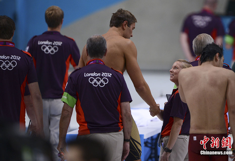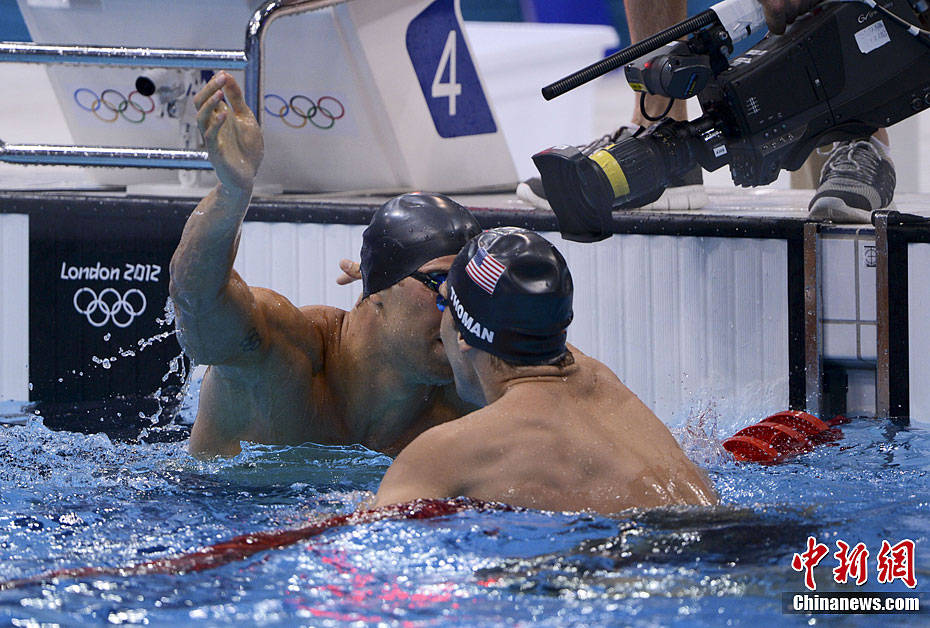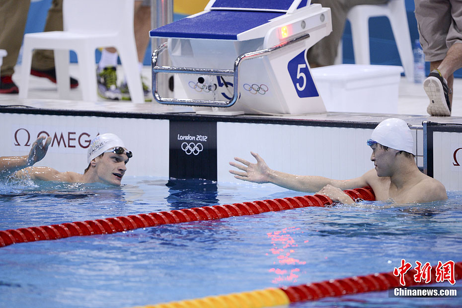 當(dāng)?shù)貢r間7月30日,倫敦奧運會舉行男子200米自由泳決賽,中國選手孫楊獲亞軍。圖為孫楊向法國選手阿格內(nèi)爾表示祝賀。記者 廖攀 攝