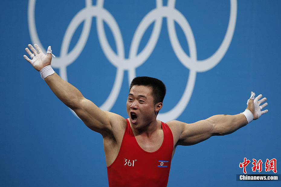 當(dāng)?shù)貢r間7月30日,2012年倫敦奧運會男子舉重62公斤級決賽中,朝鮮選手金恩國奪取金牌。記者 盛佳鵬 攝